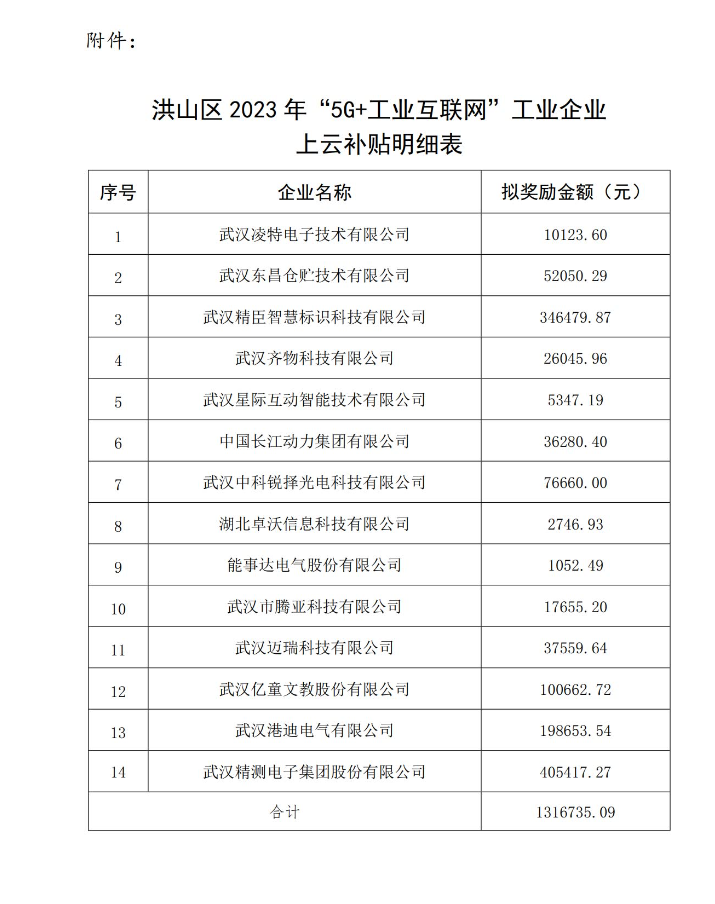 附件:洪山區2023年“5G+工業互聯網”工業企業上云補貼明細表